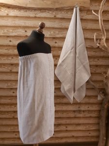 Komplekts sievietei: Lina dvielis 80x150cm un lina auduma pirts kleita sievietei ar vertikālu tautisku gaišu pelēkbaltu lentu.