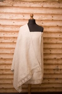 Komplekts sievietei: Lina auduma pirts kleita sievietei un dvielis 80x160cm ar 7 cm platu pelēku lina mežģīni – gulbji. Kleita ar gumiju un lipekli (krāsa-gaiši pelēka)
