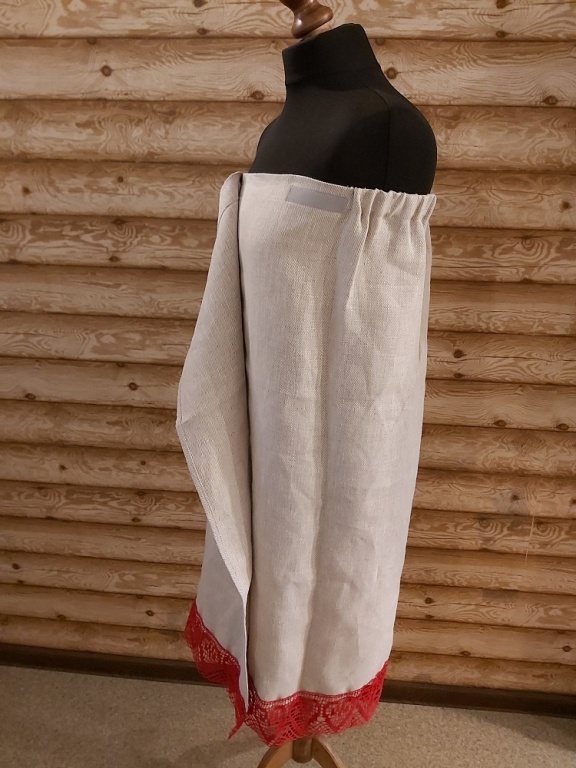 Lina auduma pirts kleita ar lipekļa aizdari augšdaļā un muguras daļā no viena sāna līdz otram sānam iestrādāta 2 cm plata gumija. Apkārtmērs augšdaļā izstiepjot gumiju līdz ~102 cm. Sieviešu pirts kleitai garums ir 80cm, ieskaitot 10cm platu mežģīni.