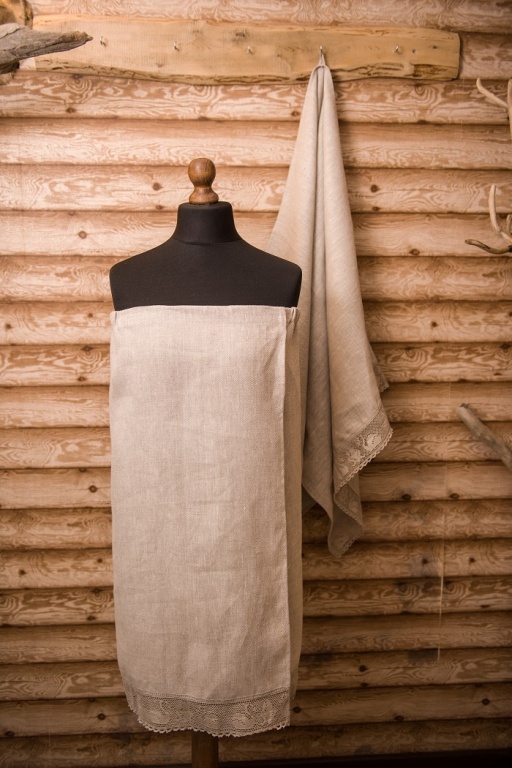 Komplekts sievietei: Lina auduma pirts kleita sievietei un dvielis 80x160cm ar 7 cm platu pelēku lina mežģīni - gulbji. Kleita ar gumiju un lipekli (krāsa-gaiši pelēka)