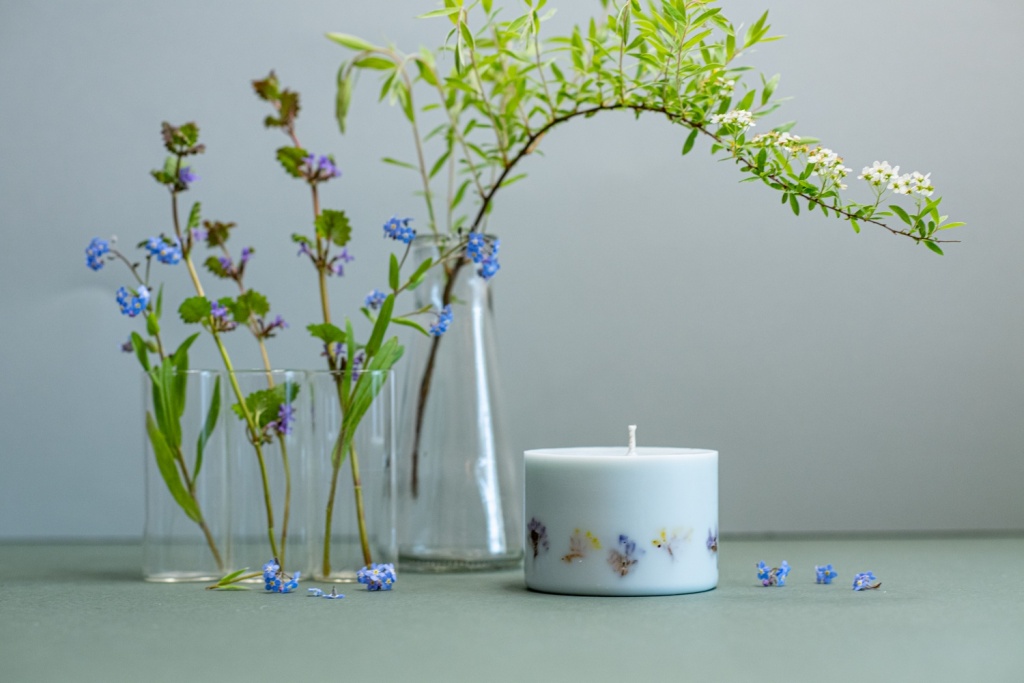 Sastāvs: dabīgais sojas vasks, kokvilnas dakts, kaltēti ziedi, eikalipta un rozmarīna ēteriskās eļļas.
